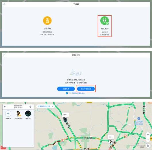 在高德地圖車鏡版中選擇“組隊出行”,輸入隊長發來的組隊口令,就可以組隊出行了