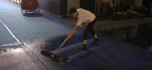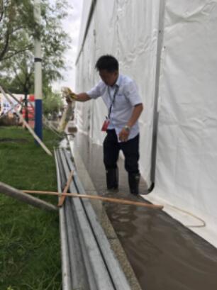 其中李鵬、宋燚 、劉宇飛、趙黎達等員工天還沒有亮,拿著手電筒帶著排水工具趟過淹沒膝蓋的積水,通過疏通下水道井蓋排水、開啟室外展館圍擋通風、抽水機抽水等方法而忙碌著,只為確保展會活動工作有序進行。