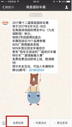 參與“免費搶票”的方式非常簡單,搜索微信公眾號“南昌國際車展”,關注車展官方微信,進入微信服務號后查看菜單欄的“免費搶票”,按照提示填入基本信息即可搶票成功。展前半個月將收到一條提示短信,包含電子票鏈接(點擊鏈接打開圖片即可查看票面信息,請妥善保管,憑票面二維碼在車展現場掃碼觀展)。