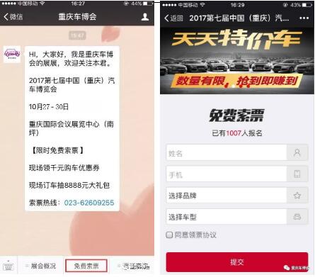 “重慶車展”官方微信已正式開啟免費索票通道,車友們可通過索票通道免費獲取原價30元/張的重慶車展門票一張。與此同時,索票成功的車友,在車展現場簽到,即可獲得組委會為您準備的環保購物袋、鑰匙扣、手機數據線、手機鋼化膜、車用香水等精美禮品。數量有限,送完即止。