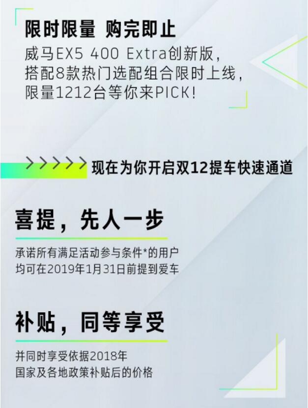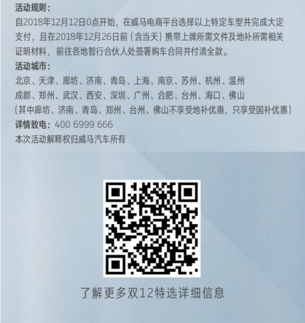 此次“雙12特選”活動將從2018年12月12日0點開始,用戶可在威馬電商平臺“雙12特選”活動專題頁面,選擇特定車型并完成大定支付,且在2018年12月26日前(含當天)在各智行合伙人處付清全款的用戶,均可在2019年1月31日前提到愛車,并同時享受2018年國家及各地政策補貼后的價格,以及威馬汽車直擊用戶痛點的666服務權益。