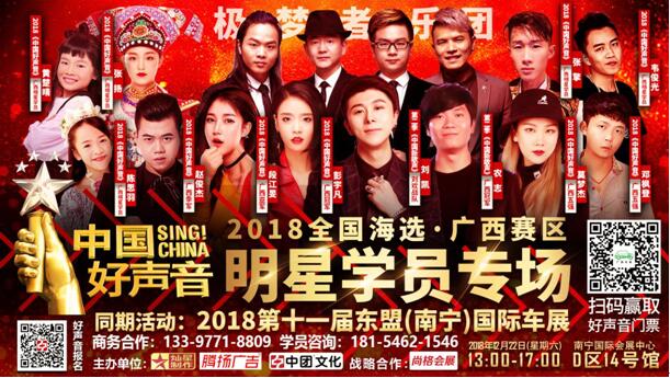 2019中國好聲音全國海選廣西賽區明星學員巡演:13位中國好聲音明星學員南寧巡演,第二季《中國新歌聲》劉歡戰隊劉凱激情獻唱,廣西本土知名樂團極夢者樂團現場助陣。