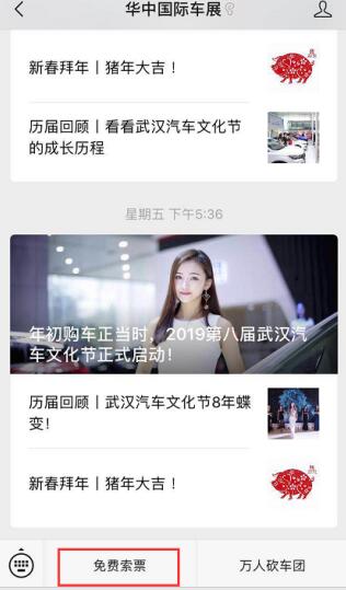 ① 進入“華中國際車展”官方微信,點擊“免費索票”