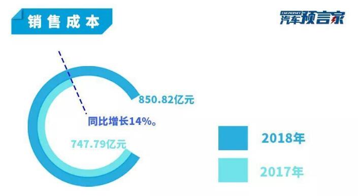 根據(jù)財報,吉利汽車2018年銷售成本為850.82億元,相比于2017年的747.79億元,同比增長14%。雖然銷售費用上漲不少,但總體來看,2018年銷售費用占營業(yè)額4.2%,就2017年的4.4%有所下降。這意味著,吉利以更少的資金投入占據(jù)了更多的市場占有率。