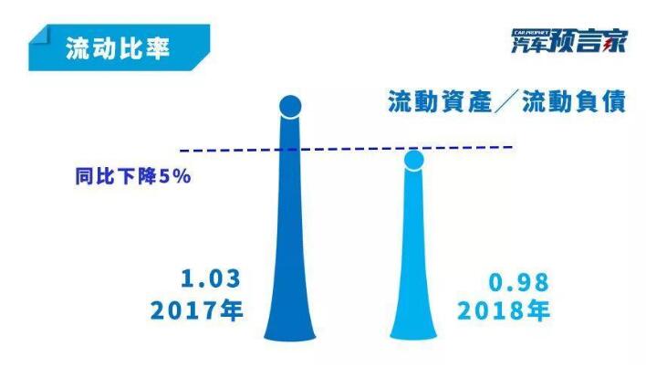 此次吉利發(fā)布的2018業(yè)績報告中提出,截止到2018年底,吉利汽車流動比率(流動資產(chǎn)/流動負(fù)債)約為98%(0.98),與2017財年末期相比,該數(shù)據(jù)有一定程度降低,2017財年末該數(shù)據(jù)為1.03。