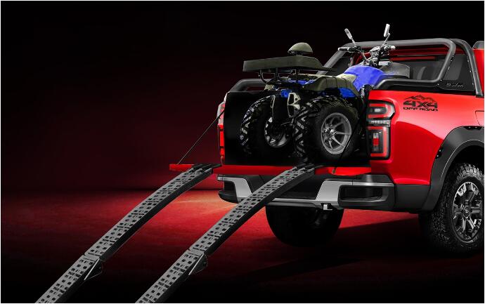 尾燈同樣采用了全LED光源,與車頭形成呼應。尾門板上也特意加裝了一塊大尺寸熏黑處理的面板,從圖片上看,這款越野皮卡的后箱配有坡道梯卡槽,便于梯子搭接到貨箱后板,方便裝卸越野摩托車等。