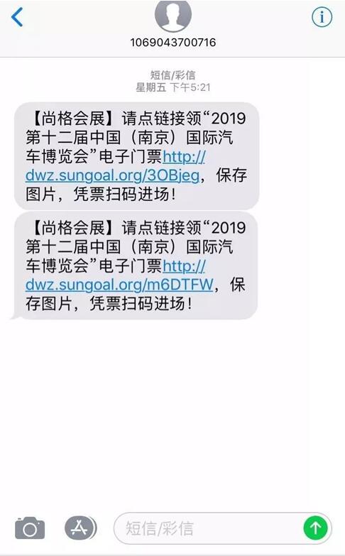 3、接下來,請注意接聽來自客服小姐姐的電話,客服將為您發送車展電子門票。電子門票為一條帶鏈接的短信。點開鏈接,即是電子門票,可截圖,憑票入場。
