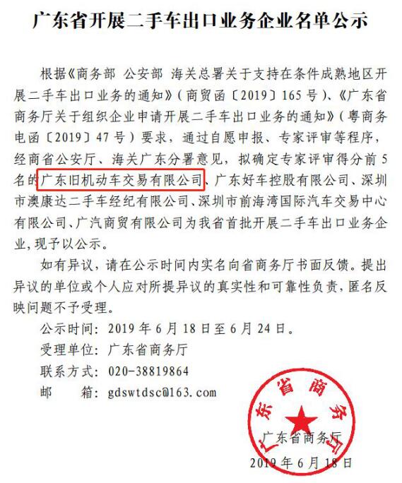 6月25日 在廣東眾多競爭對手中,廣東舊車成功脫穎而出,成為廣東省首批二手車出口試點企業之一。