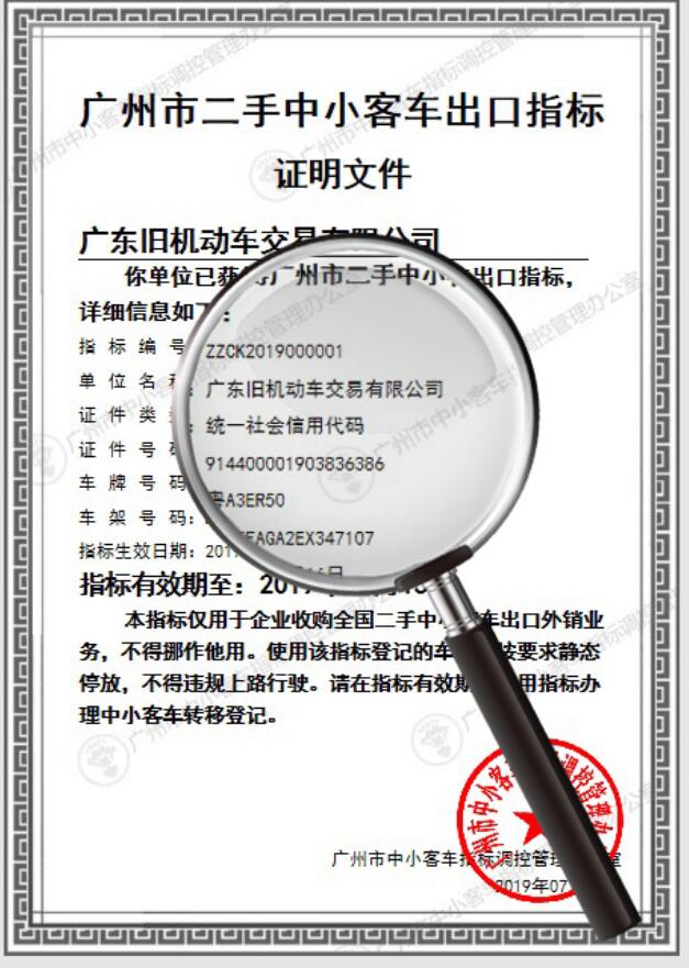 7月15日 廣東舊車獲得全國第一張二手車出口周轉指標!指標編號為ZZCK2019000001,這意味著廣東舊車將在二手車出口業務上成為廣東第一、中國首位!