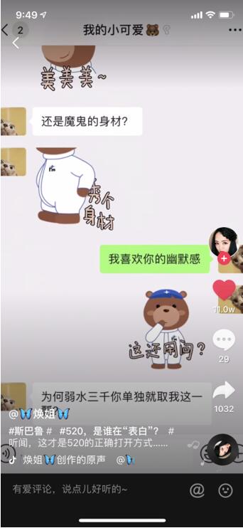 挑戰賽作為抖音平臺的官方傳播渠道,其影響力以及各項權益自不必多言,但對于那些預算相對較少的品牌商來說,具有更高性價比的操作方式才是他們真正想要的解決辦法。借用已經火起來的段子和話題進行產品或品牌內容植入,就順理成章得進入了品牌商們的眼簾。譬如,下面這條疑似斯巴魯品牌傳播的“520萌萌噠小熊”短視頻,就收獲了“90W+播放、11W點贊”的不錯數據。
