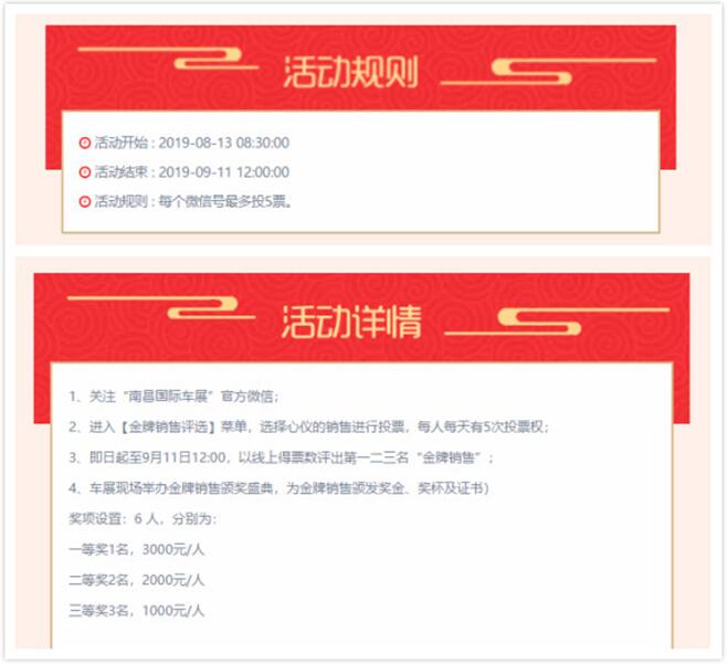 本次“金牌銷售”評選活動將由網(wǎng)友投票產(chǎn)生金牌銷售各類獎項(xiàng),于9月13日在南昌國際車展現(xiàn)場頒獎,授予豐厚的獎金和獎杯/證書。