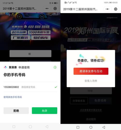 1、長按識別下圖“鄭州國際車展”小程序二維碼或官方微信菜單“免費領券”,輸入昵稱,點擊“免費領券”,允許授權微信;