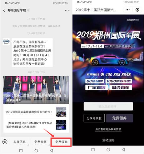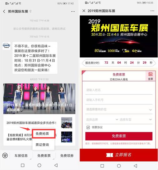 1、關注“鄭州國際車展”官方微信,選擇菜單欄“免費索票”,點擊“免費搶票”;