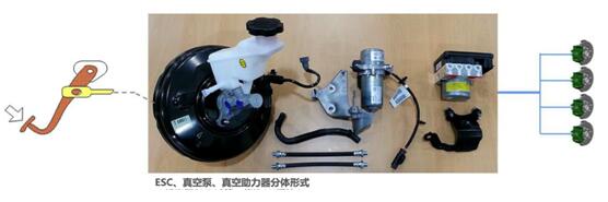 在目前新能源市場中,多數產品的制動系統,雖然也配備了相應的能量回收系統,但基本上都是在傳統燃油車現有結構基礎上,進行技術改進而來,一般分為行車制動系統、駐車制動系統和輔助制動系統。如下圖,他們將燃油車原有的真空助力器及相關管路保留,再將另一端與電子真空助力泵連接,當傳感器監測到助力器真空度不足時,電子真空泵開始工作,維持真空環境,通過這樣的方式,確保真空助力器能夠像原先一樣為駕駛員提供輔助作用。