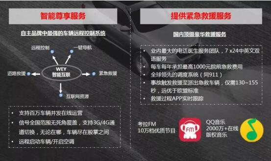 最后還有WEY品牌的智享互聯服務,涵蓋了遠程控制、日常服務、道路救援三大類功能。在上車之前,就可以用手機控制啟動車輛、預約開啟空調,而在發生事故時,還能第一時間撥打救援服務,保障人車安全。