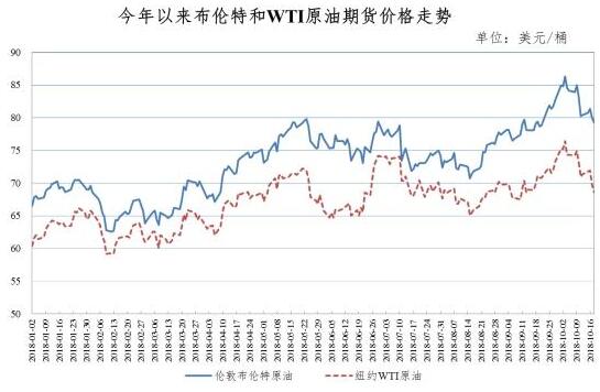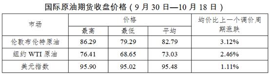 調價期初,在供應預期收緊和歐佩克無增產計劃等因素的主導下,國際油價繼續攀升,倫敦布倫特、紐約WTI油價最高升至每桶86.29美元和76.41美元,為近四年高位。隨后由于美國股市大幅下跌、美國原油庫存超預期上升、原油供應增長而需求預期下滑等,國際油價迅速從高位回落。目前兩市油價分別為每桶79美元和69美元,較本月最高點降幅達7美元,回落至9月末的水平。