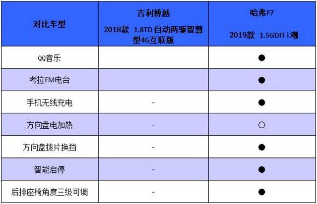 哈弗F7 2019款 1.5GDIT i 潮和吉利博越2018款 1.8TD 自動兩驅智慧型4G互聯版在AI智能網聯方面都不相上下,都可以通過語音控制車上的空調、導航、車窗等功能。但哈弗F7 2019款 1.5GDIT i 潮不僅引入了擁有2000萬首歌曲版權的QQ音樂和10萬檔考拉FM電臺節目,其搭載的超級互聯系統,僅需一個APP即可成為專屬全時私人助理,用車、維修、保養全不費心。相比吉利博越2018款 1.8TD 自動兩驅智慧型4G互聯版,哈弗F7 2019款 1.5GDIT i 潮還支持手機無線充電、方向盤撥片換擋、發動機智能啟停技術、后排座椅角度三級可調等實用的功能。