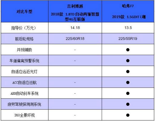說到配置就必須從價格入手。考慮到兩款車的價格區間有所重疊,博越現款車型普遍有5000到10000元不等的優惠幅度,為此我們選出售價為13.50萬的哈弗F7 2019款 1.5GDIT i 潮和售價為14.18萬的吉利博越2018款 1.8TD 自動兩驅智慧型4G互聯版,這兩款車型進行對比。