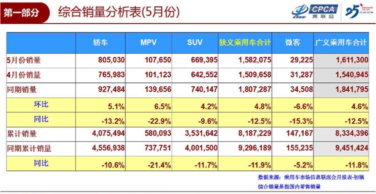 根據乘聯會的產銷數據統計顯示,1-5月汽車產銷分別完成819.7萬輛和818.7萬輛,產銷量比上年同期分別下降16%和11.9%。多方因素綜合作用導致中國車市增長乏力,從長期來看,以家庭出行剛需為主的首購消費已經基本完成,汽車行業也逐漸進入網約、租賃等智能出行時代;其次,房屋消費大幅度擠壓汽車改善型消費,居民收入增速也在放緩。而從短期看,國六標準的提前執行、一線城市發達地區限行限購政策等因素均影響了汽車消費的增長速度。