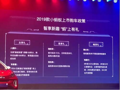 而本次2019款小螞蟻,除在產品端繼續為用戶帶來了巨大的升級驚喜之外,在購車政策上也體現了其作為行業領軍品牌滿滿的誠意,尤其是其配合“螞蟻聯盟”的多項專屬會員福利,更顯示出其對升級用戶服務,以及更懂用戶、反饋用戶上的用心。而隨著新車銷售政策的出臺,未來這款“更懂你的智趣純電小車”又將為我們交上一份怎樣的答卷,一同拭目以待。