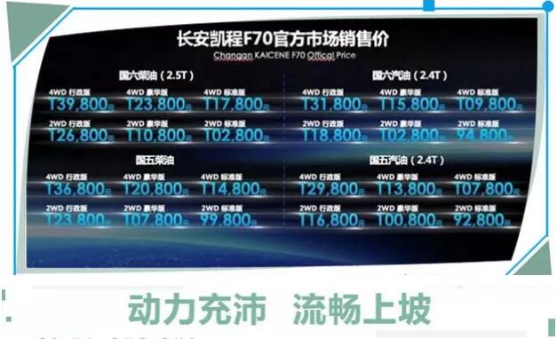 這次筆者所駕駛的車型為長安凱程F70VM2.5T國五柴油四驅(qū)標軸行政版,官方指導價13.68萬元。同時,包括國五、國六排放標準的柴、汽油車型均已正式上市,售價為9.28萬—13.98萬元。各車型具體售價如下圖所示。
