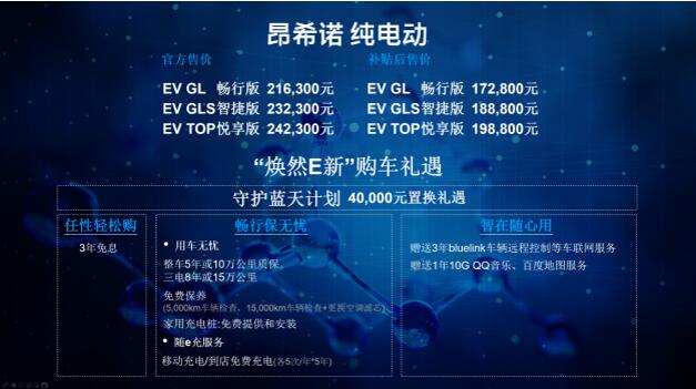 首先必須說(shuō)下昂希諾純電動(dòng)實(shí)實(shí)在在的銷售政策。在2019年11月4日上市的昂希諾電動(dòng)共發(fā)布3款車型,官方指導(dǎo)價(jià)21.63-24.23萬(wàn)元,補(bǔ)貼后售價(jià)17.28-19.88萬(wàn)元。 并且相應(yīng)的銷售政策更是吸引人,特別推出的“守護(hù)藍(lán)天”計(jì)劃:對(duì)于全國(guó)用戶,不限汽油牌照或新能源牌照,截至2019年12月31日前,凡通過(guò)置換形式購(gòu)買昂希諾純電動(dòng),即可享有4萬(wàn)元置換補(bǔ)貼。與此同時(shí),還推出了“煥然E新”購(gòu)車禮遇:全國(guó)范圍內(nèi),凡購(gòu)車用戶均可以享受3年免息貸款;在售后服務(wù)上實(shí)施整車5年或10萬(wàn)公里質(zhì)保,三電8年或15萬(wàn)公里質(zhì)保,還可免費(fèi)獲贈(zèng)家用充電樁及安裝服務(wù),更享3年免費(fèi)bluelink車輛遠(yuǎn)程控制等車聯(lián)網(wǎng)服務(wù)以及1年10G QQ音樂(lè)、百度地圖服務(wù)。