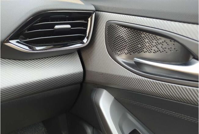 (內飾細節:左上軟質包覆,中間碳纖飾板,門把磨砂材質+鏤空音響,下方雙縫線)