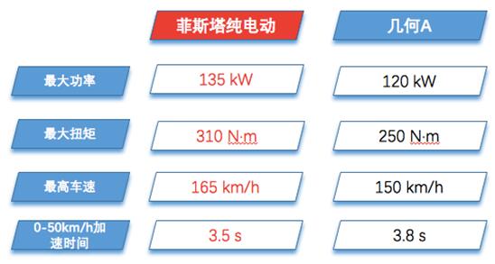 這里,我們不妨對比一下,與菲斯塔純電動同級別的幾何A。該車電機是由精進(JJE)和方正(FDM)提供,將電機與減速器進行二合一,并采用分體式布局,這樣的方式,不如“三合一”集成式布局那么緊湊,再加上線材的原因,導致性能表現并不突出。諸如最大功率120kW,最大扭矩250N•m,最高車速150 km/h,0-50km/h加速需要3.8秒,均不如菲斯塔純電動優勢明顯。