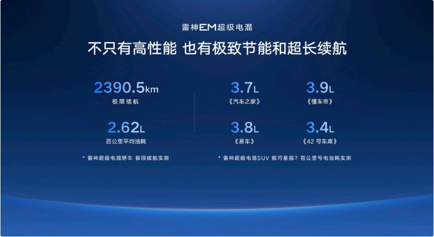 10月30日,吉利汽車正式發布了全球新一代超級電混——雷神 EM-i 超級電混,在極致節能與超長續航表現方面,搭載了雷神 EM-i超級電混的測試車,最終跑出了2390.5km的超長續航數據,平均油耗僅2.62L/100km,可謂是超越市場同級的極致表現。