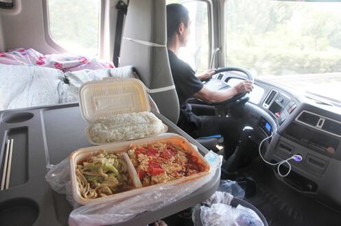 臨近中午,任紅照睡醒接班。任偉鋒給前方高速公路附近一家飯館打電話訂了盒飯,車到約定地點,停車、交錢、拿飯、再上路,前后也就3秒鐘。“我們平時都是如此,時間太緊張,能不進服務區就不進服務區。”任紅照曾經一個人跑過全程,除了解決“方便”,一刻不停,“幸虧乘龍H7舒適性好,座椅和臥鋪都很舒服,不然這一路的罪可夠受的”。