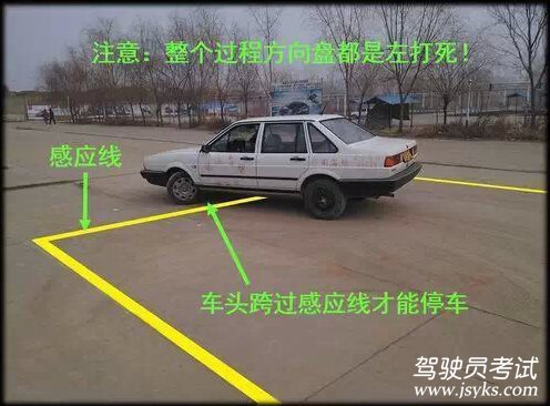 當(dāng)車(chē)身與左出庫(kù)線(xiàn)平行后,繼續(xù)前進(jìn),直到車(chē)頭向左傾斜,并且跨過(guò)左感應(yīng)線(xiàn),這時(shí)再踩剎車(chē),停住。