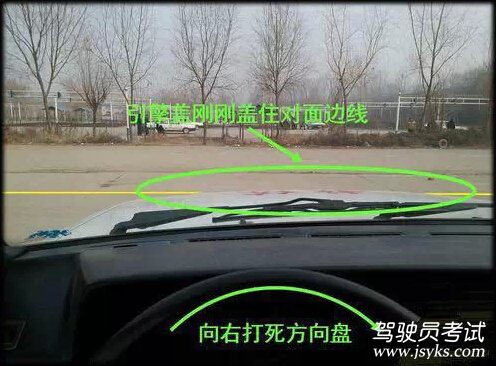 掛一檔,帶正車(chē)頭,直線(xiàn)出庫(kù)。當(dāng)車(chē)頭引擎蓋剛剛蓋住庫(kù)對(duì)面邊線(xiàn)時(shí),向右打死方向盤(pán)。