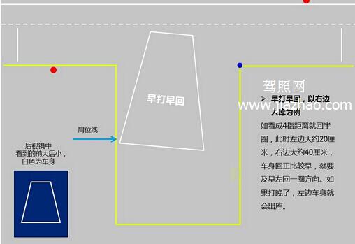 倒車入庫修正口訣:早打早回,晚打晚回,哪里夾角大向哪里修方向。