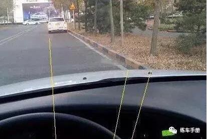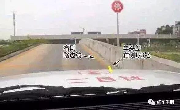 將發動機前蓋三等分。當發動機前蓋右側的三分之一處與路邊線重合時,車身距離邊線剛剛好就是30cm。