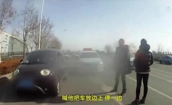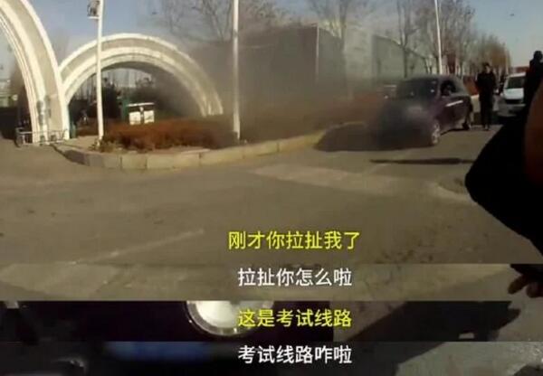 男子不僅將車停在馬路中間擋住考試車,他還和一名女子一起擋在了考試車前。