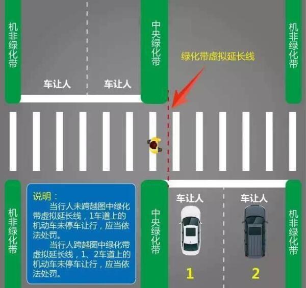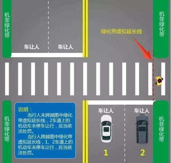 ▲行人未跨越綠化帶延伸線時,2車道上的機動車可通行,1車道應禮讓;而當行人跨越綠化帶延伸線時,1、2車道都應禮讓。