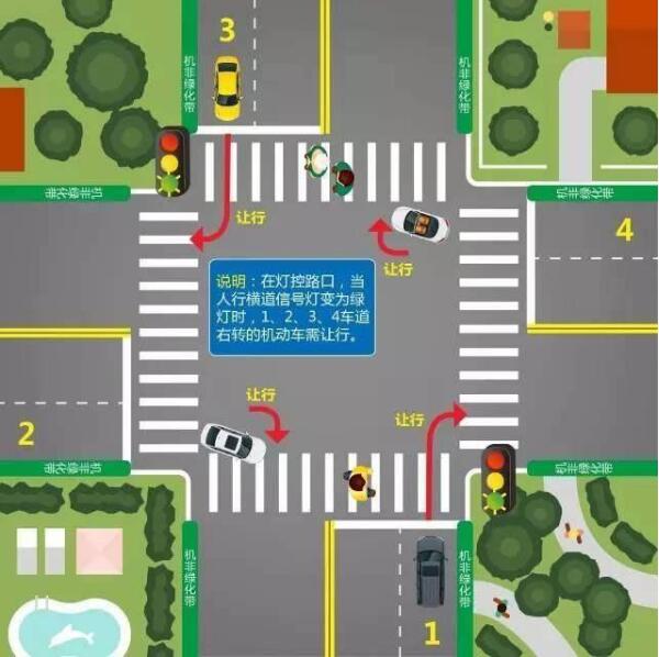 ▲圖為路口右轉讓行。當人行橫道信號燈變爲綠燈時,1、2、3、4車道右轉的機動車都需讓行。